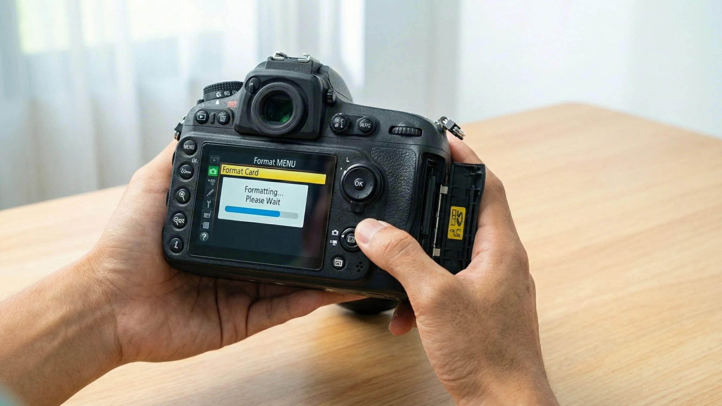 2. ฟอร์แมตผ่านกล้อง (Camera) สำหรับช่างภาพ และผู้ใช้กล้องหน้ารถ เป็นกฎเหล็กที่ควรทำ เพราะกล้องจะจัดระเบียบโครงสร้างโฟลเดอร์ (DCIM/MISC) ให้ตรงสเปกที่สุด ลดอาการไฟล์ภาพหายได้ดีที่สุด